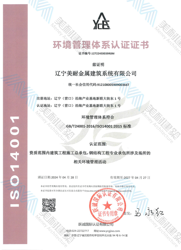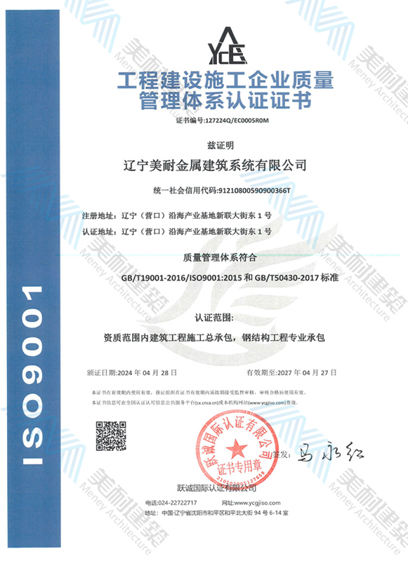 遼寧美耐金屬建筑系統(tǒng)有限公司位于遼寧(營口)沿海產(chǎn)業(yè)基地,專注于預(yù)制金屬建筑系統(tǒng)領(lǐng)域,是一家集工業(yè)建筑設(shè)計、制作、施工及相關(guān)的技術(shù)咨詢與服務(wù)為一體的綜合性服務(wù)企業(yè)。作為國家鋼結(jié)構(gòu)協(xié)會會員、中國建筑金屬結(jié)構(gòu)協(xié)會會員單位與國家高新技術(shù)企業(yè),美耐建筑集建筑工程施工總承包、鋼結(jié)構(gòu)工程專業(yè)承包等多種資質(zhì)于一身,并擁有22項鋼結(jié)構(gòu)建筑領(lǐng)域?qū)@?項軟件著作權(quán)。